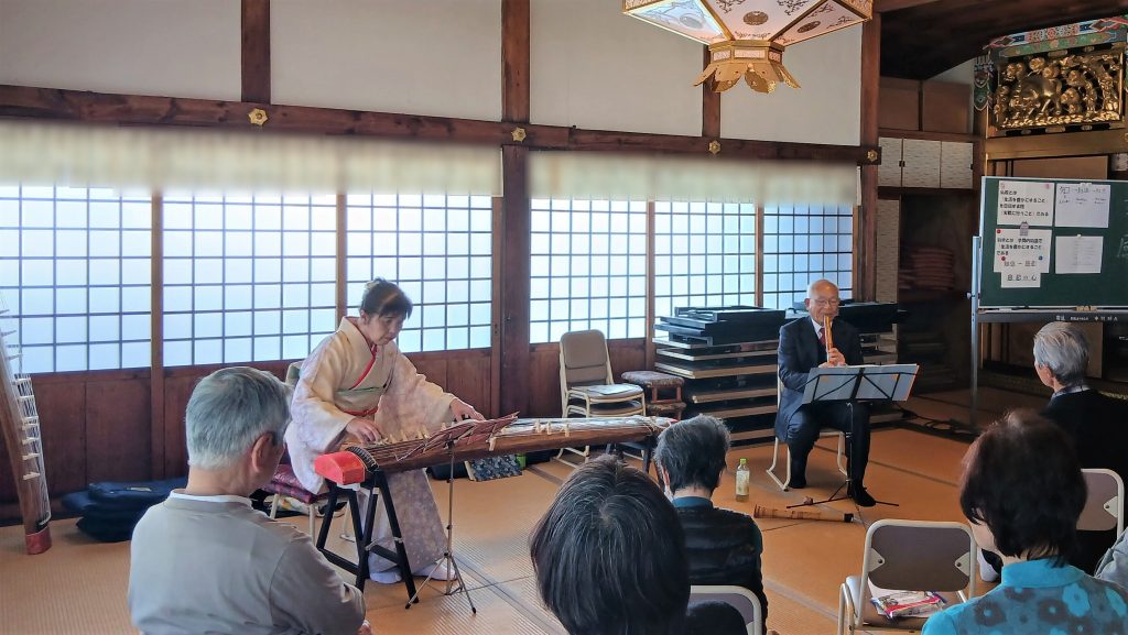 コンサートでは、お琴のやさしい響きと尺八の深みのある音色が本堂いっぱいに広がり、皆さまじっくりと聴き入っておられました。