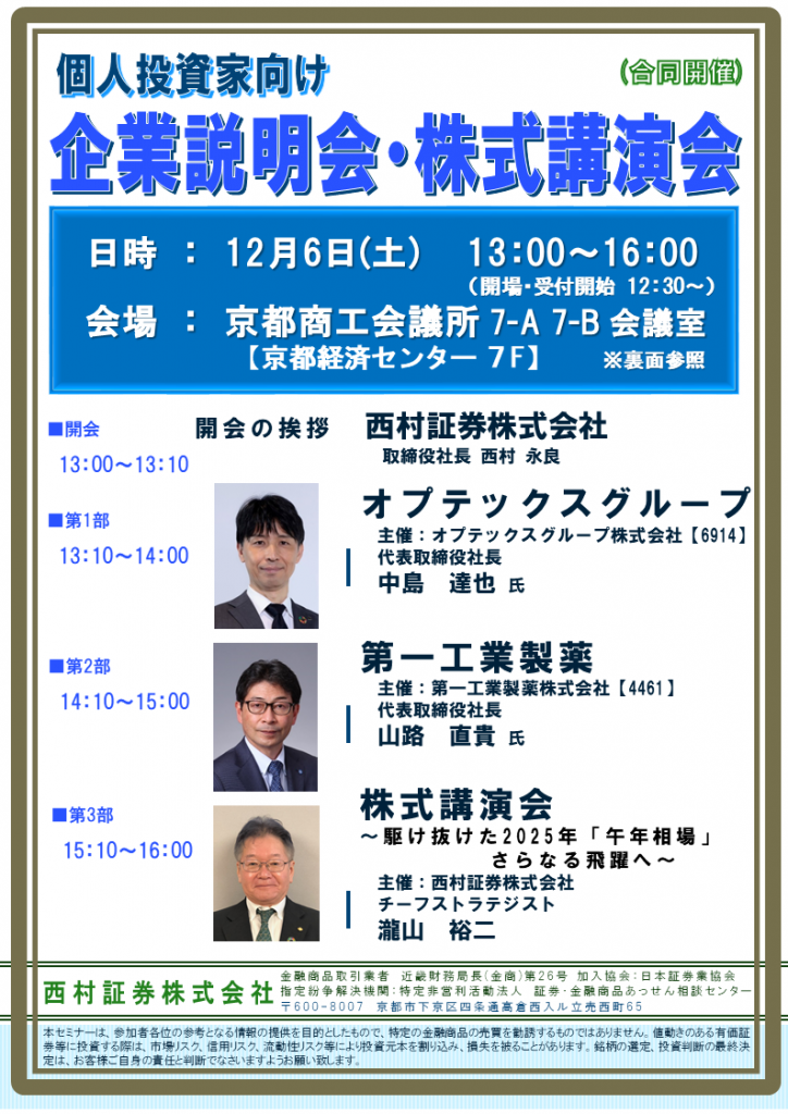 | 三洋化成工業 個人投資家向けIRセミナー 平和堂 個人投資家向けIRセミナー 西村証券 株式講演会(講師:チーフストラテジスト瀧山裕二) |