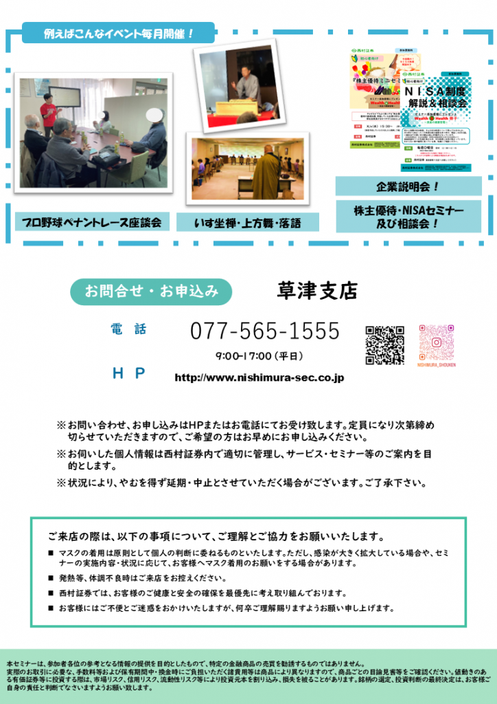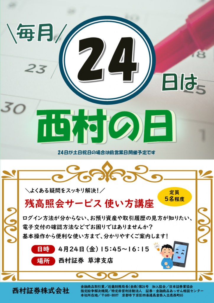 セミナー西村の日開催予定草津支店 西村の日【草津支店】 2026.04.03 4月の草津支店西村の日は「残高照会サービス 使い方講座」を開催いたします。 HPからのお申し込みはこちら 草津支店の情報はこちら