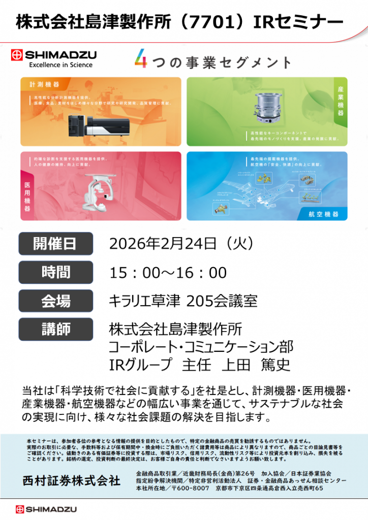セミナー西村の日開催予定草津支店 西村の日【草津支店】 2026.01.26 2月の草津支店西村の日は「(株)島津製作所IRセミナー」を開催いたします。 HPからのお申し込みはこちら 草津支店の情報はこちら