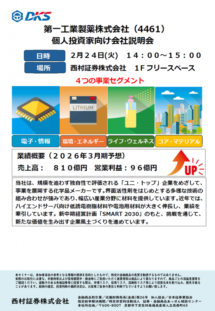 セミナー西村の日開催予定本店 西村の日【本店】 2026.01.26 2月の本店西村の日は「ミニIRセミナー 第一工業製薬(株)」と「米国株セミナー」を開催いたします。 HPからのお申し込みはこちら 本店の情報はこちら
