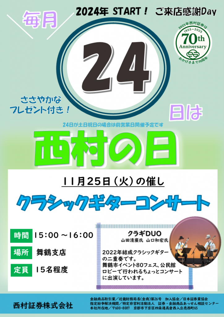 セミナー西村の日開催予定舞鶴支店 西村の日【舞鶴支店】 2025.10.27 11月の舞鶴西村の日は「クラシックギターコンサート」を開催いたします。 HPからのお申し込みはこちら 舞鶴支店の情報はこちら