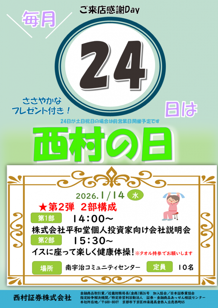 セミナー西村の日開催予定大久保支店 西村の日【大久保支店】 2025.12.17 1月の大久保支店西村の日は「株式会社平和堂個人投資家向け会社説明会」と 「イスに座って楽しく健康体操!」を開催いたします。 HPからのお申し込みはこちら 大久保支店の情報はこちら
