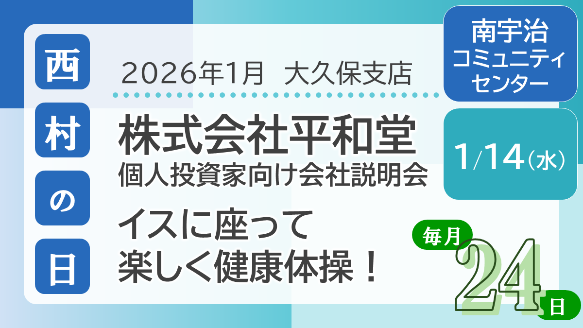 1月の大久保支店西村の日は「株式会社平和堂個人投資家向け会社説明会」と 「イスに座って楽しく健康体操!」を開催いたします。 HPからのお…
