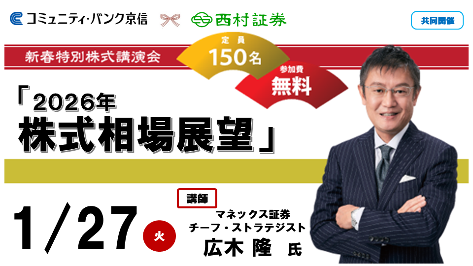 1月27日(火)、コミュニティバンク京信様との共催で「新春特別株式講演会」を開催いたします!当日は、マーケット分析で高い評価を得ているマネック…
