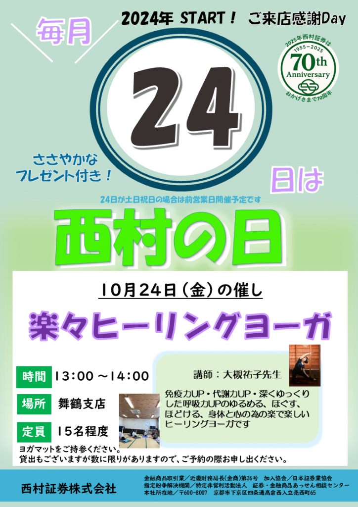 10月の舞鶴西村の日は「楽々ヒーリングヨガ」を開催いたします。