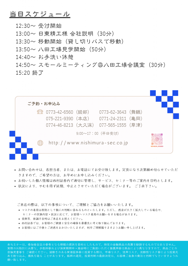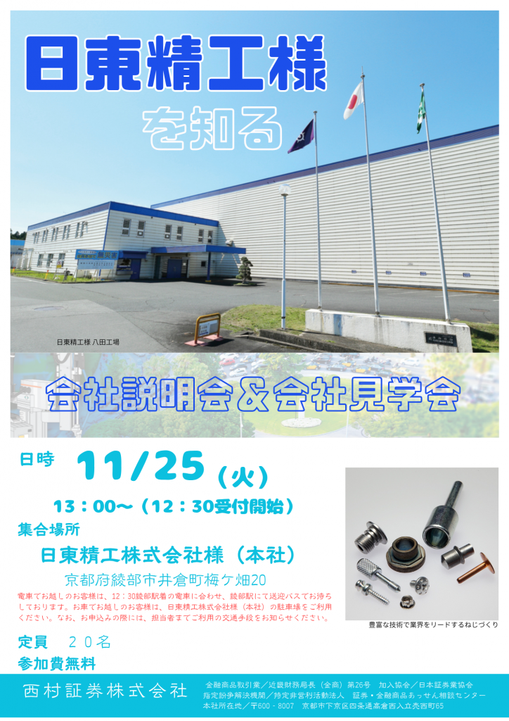 セミナー開催予定綾部支店 11/25(火)日東精工様を知る 会社説明会&会社見学会 2025.10.09 11/25(火)日東精工株式会社様 会社説明会&会社見学会を開催致します。 HPからのお申し込みはこちら 綾部支店の情報はこちら