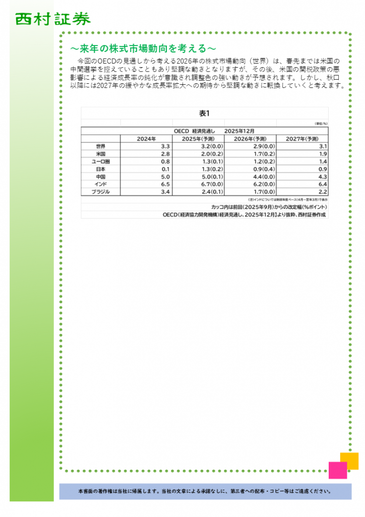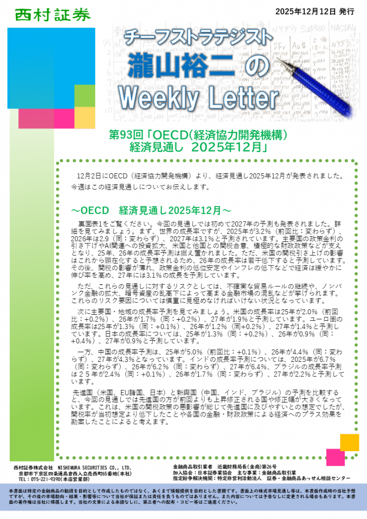 西村証券チーフストラテジスト瀧山裕二によるレポートです。